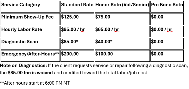 Compassion Rate (At-Cost): Reserved for individuals facing documented unfortunate circumstances (job loss, medical emergency, etc.). I charge only for fuel and materials; labor is provided at no cost. This option will require an application form and very short interview follow up if further questions are needed, and approved case by case.